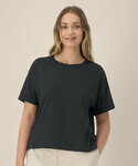 Women’s cotton modal t-shirt. Set-in sleeves. Longer back with curved hem. 1x1 rib at collar. Self-fabric back neck tape. Twin-needle topstitching at sleeve cuffs and hem. Contains 60% OCS-certified organic cotton, certified by Control Union CB-CUC-1393082. Contains 40% Modal (TENCEL™).