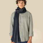50% cotton/50% viscose. Hand woven with fringes.Decorated with contrasting navy and beige stripes.Tag free.Scarves may vary slightly in colour from one piece to the next, a sign of authentic craftsmanship.